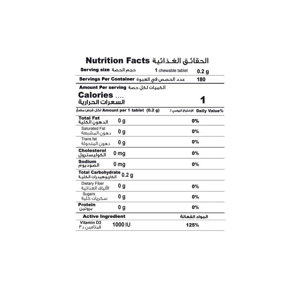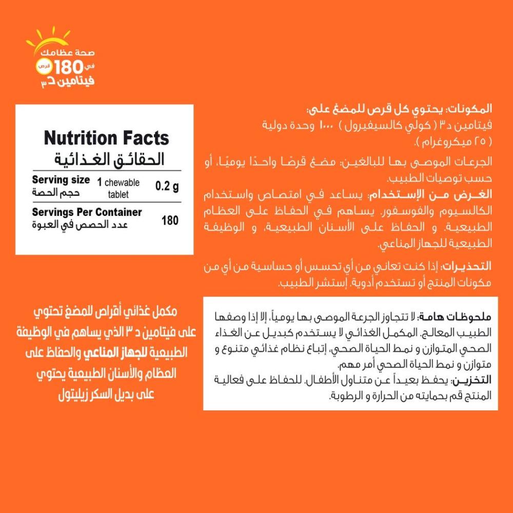 - تتميز أقراص فيتامين د3 القابلة للمضغ بطعم البرتقال اللذيذ بنكهة البرتقال الطبيعية وهي خالية من السكر وخالية من الغلوتين ومناسبة للنباتيين. يوفر كل قرص 1000 وحدة دولية من فيتامين D3، لذلك كل ما تحتاجه هو قرص واحد في اليوم.
