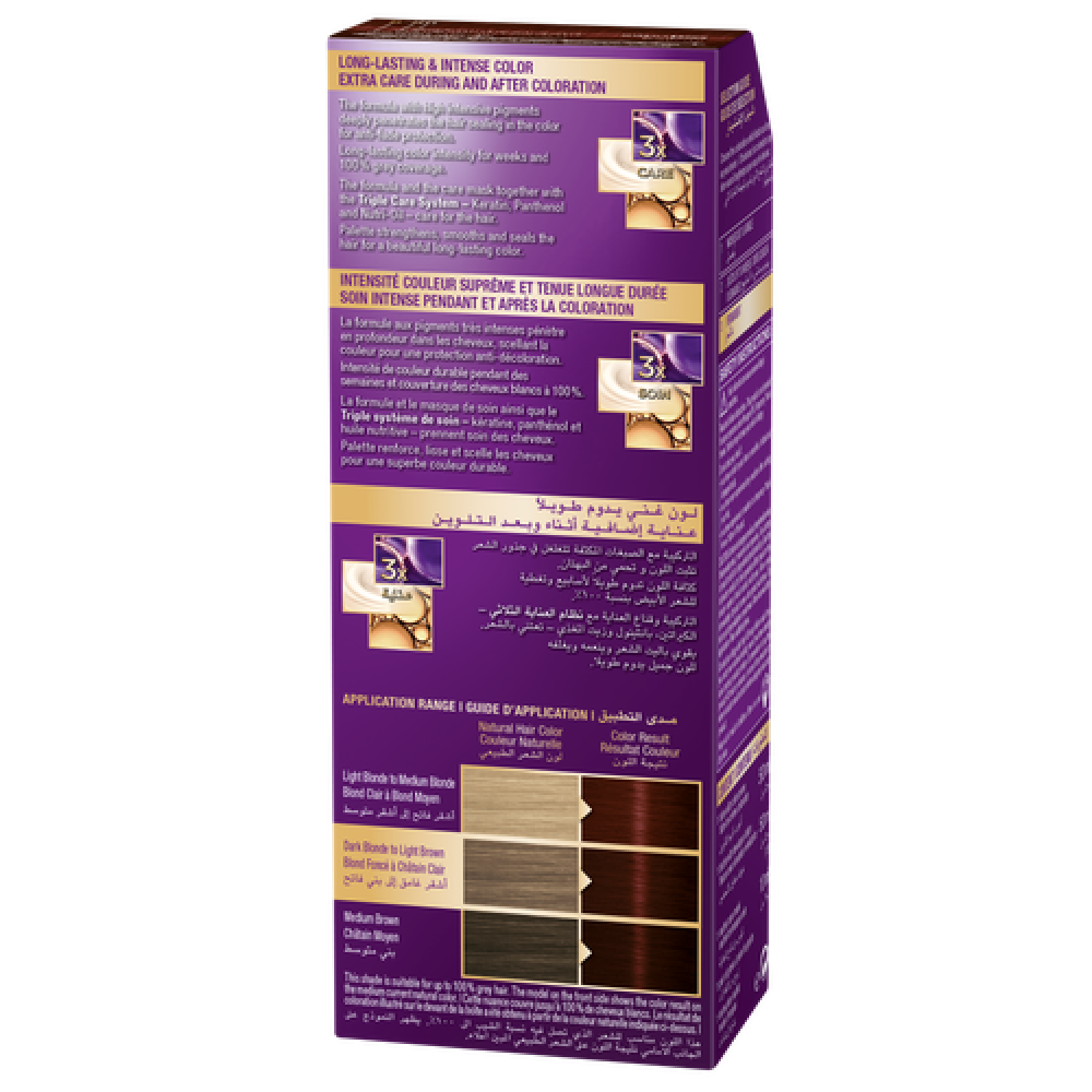 وصف المنتج: كريم شوارزكوف باليت إنتنسيف كولور 680 مارسالا براون عناية إضافية أثناء وبعد الصبغة: التركيبة وقناع العناية مع نظام العناية الثلاثي - الكيراتين والبانثينول ونيوتري أويل - يعتنيان بالشعر. لون يدوم طويلاً وكثيف: التركيبة ذات الصبغات عالية الكثافة تخترق الشعر بعمق وتغلق اللون لحماية من بهتان اللون. كثافة لون تدوم طويلاً لأسابيع وتغطية 100٪ للشعر الرمادي. تعمل الباليت على تقوية الشعر وتنعيمه وإغلاقه للحصول على لون جميل يدوم طويلاً. طريقة الاستخدام: 1. التحضير: لا يُنصح بغسل شعرك لمدة 24 - 48 ساعة قبل الاستخدام. ارتدِ القفازات المرفقة. افتح زجاجة المظهر واسكب المحتويات في وعاء زجاجي أو خزفي. إذا كان شعرك أطول من طول الذقن، نوصي باستخدام عبوتين من كريم باليت إنتنسيف كولور. افتح الأنبوب وادفع الطرف العلوي للغطاء عبر غشاء الأنبوب وأضف كريم اللون إلى لوشن المظهر. امزج جيدًا (لا تستخدم أدوات معدنية) حتى تمتزج جميع المكونات تمامًا. غطي كتفيك بمنشفة. للحصول على أفضل النتائج، يرجى الاستخدام فورًا وعدم ترك أي بقايا. 2. التطبيق الكامل (الرأس بالكامل): يوصى بهذا التطبيق إذا كنت تصبغ شعرك بشكل دائم لأول مرة، أو إذا كان لون شعرك السابق قد نما، أي لا يوجد نمو مرئي. ضع الخليط أولاً على الشعر الجاف، بدءًا من مؤخرة العنق بمساعدة فرشاة. اترك حوالي 2 سم حرة عند جذور الشعر. ضع خليط الصبغة بالتساوي في جميع أنحاء الشعر. ثم ضع الخليط على جذور الشعر أيضًا. اترك الخليط لمدة 30 دقيقة. 3. تطبيق إعادة النمو: هذا التطبيق ضروري إذا كان شعرك مصبوغًا بالفعل بشكل دائم، وكان نموه مرئيًا، أو كانت أطراف شعرك أغمق أو في حالة سيئة. ضع الخليط على الشعر الجاف بمساعدة فرشاة على منطقة إعادة النمو فقط. لا يوصى بغسل شعرك قبل 24 إلى 48 ساعة من الاستخدام. اترك الخليط في منطقة إعادة النمو لمدة 20 دقيقة. وزّعيه بالتساوي على الشعر باستخدام مشط ذي أسنان متباعدة. اتركيه لمدة 10 دقائق إضافية. 4. الشطف: اشطفي الشعر جيدًا بالماء الدافئ بعد انتهاء وقت التعرض حتى يصبح الماء صافيًا. 5. بعد العلاج: ضعي قناع العناية على الشعر المبلل. اتركيه لمدة دقيقتين ثم اشطفيه جيدًا. تحذيرات وتحذيرات: قد تسبب ملونات الشعر ردود فعل تحسسية شديدة. اقرأي التعليمات واتبعيها. هذا المنتج غير مخصص للاستخدام لمن تقل أعمارهم عن 16 عامًا. قد تزيد وشم "الحناء السوداء" المؤقت من خطر إصابتك بالحساسية. لا تصبغي شعرك إذا: كنت تعانين من طفح جلدي على وجهك أو فروة رأس حساسة ومتهيجة ومتضررة، أو كنت قد عانيت من أي رد فعل بعد صبغ شعرك، أو كنت قد عانيت من رد فعل تحسسي لوشم "الحناء السوداء" المؤقت في الماضي.تجنبي ملامسة المنتج للعينين واشطفيهما فورًا في حال ملامسته لهما. لا تستخدميه لصبغ الرموش أو الحواجب. اشطفي شعركِ جيدًا بعد الاستخدام. ارتدي قفازات مناسبة. أجري اختبار حساسية قبل 48 ساعة من كل صبغة (انظري أدناه)، حتى لو كنتِ قد استخدمتِ منتجات صبغ من قبل. لذا، تذكري شراء المنتج قبل 48 ساعة. في حال حدوث أي رد فعل تحسسي أو شك، استشيري طبيبًا قبل استخدام أي منتج لصبغ الشعر. يُحفظ بعيدًا عن متناول الأطفال. إذا شعرتِ بأي حرقة أو طفح جلدي أثناء الصبغة، فاشطفي شعركِ فورًا وتوقفي عن الصبغة، فقد يكون ذلك مؤشرًا على رد فعل تحسسي أكثر خطورة. تفاصيل المنتج: العلامة التجارية: باليت
