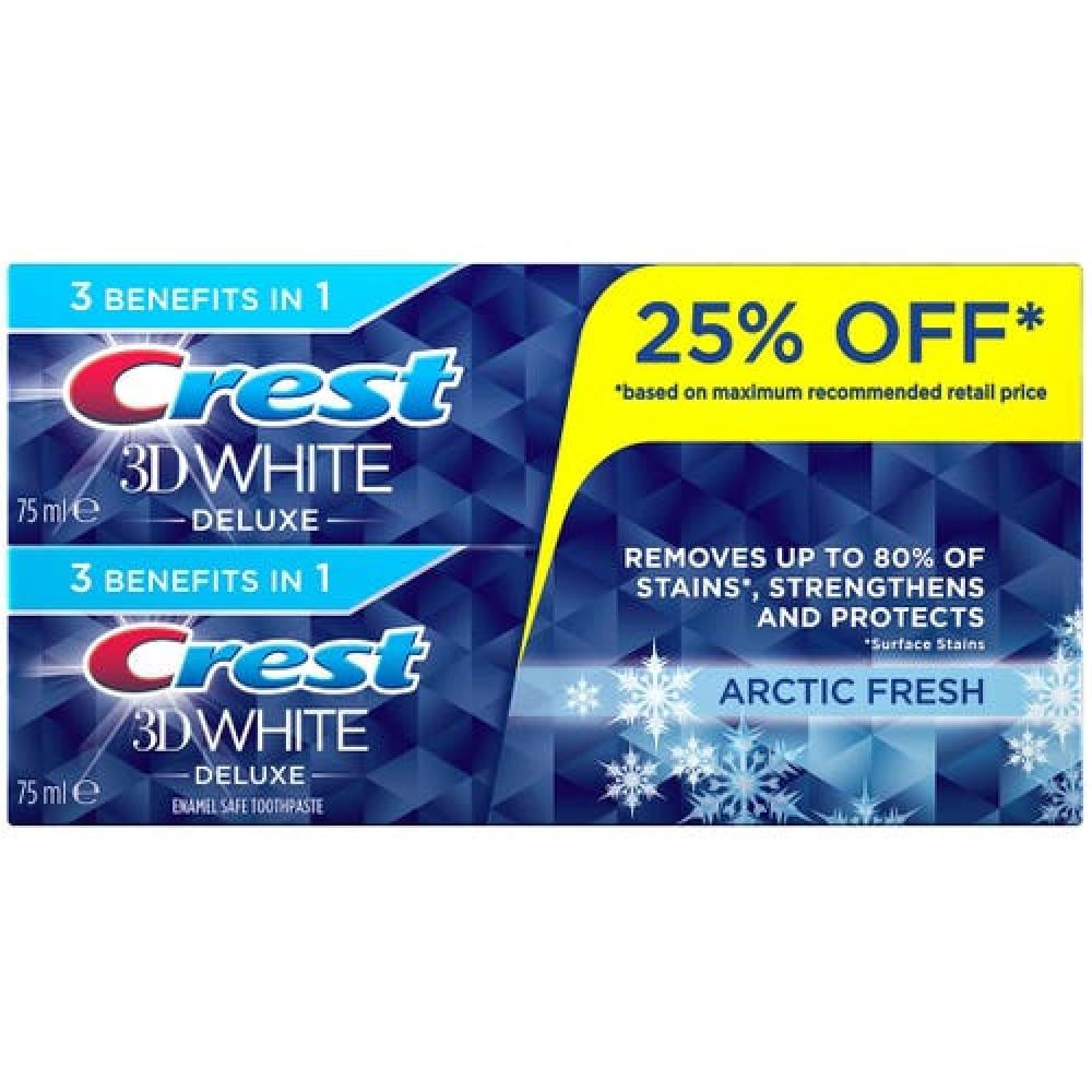 ثق بفمك بخبرة التبييض التي يوفرها معجون الأسنان Crest 3D White Deluxe Arctic Fresh. يجمع 3D White Arctic Fresh بين 3 فوائد في معجون أسنان واحد ، يبيض أسنانك ويقويها ويحميها. تركيبة المينا الآمنة تزيل بلطف البقع السطحية على الأسنان لتكشف عن ابتسامة بيضاء جميلة بينما تترك نكهة النعناع في القطب الشمالي أنفاسك منتعشة تدوم طويلاً.